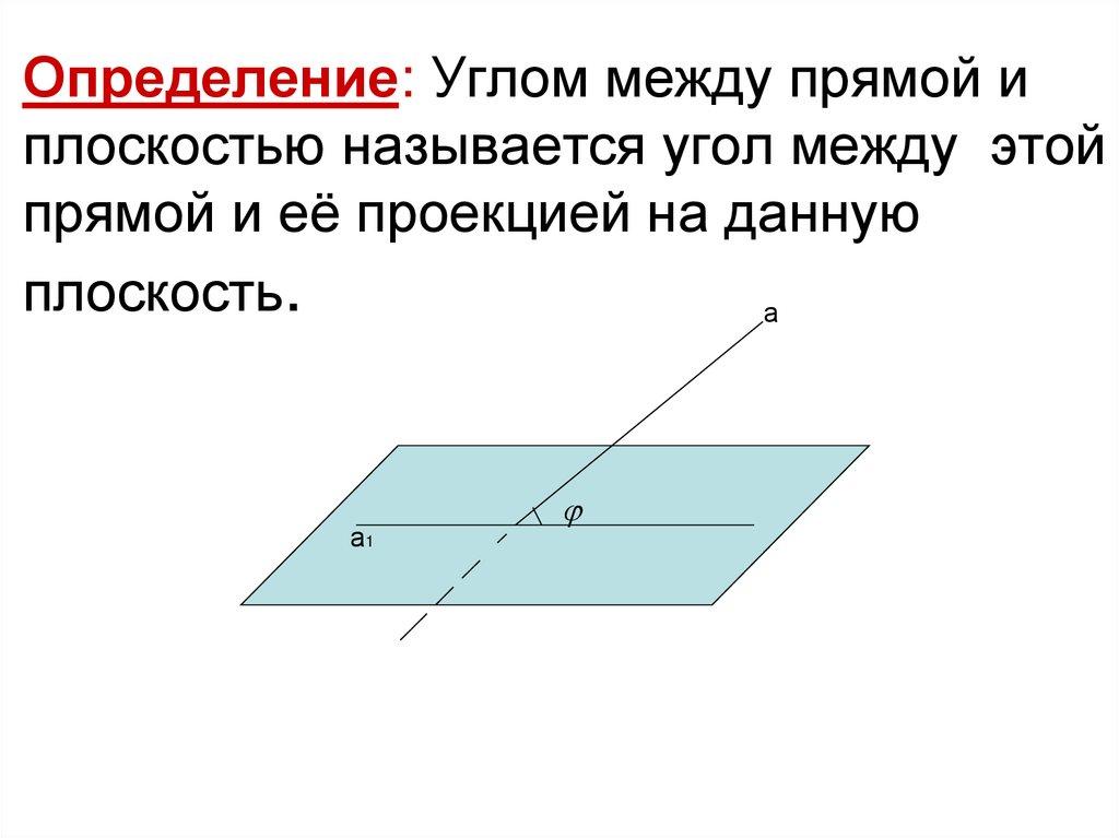 Определение: Углом между прямой иплоскостью называется угол между этой