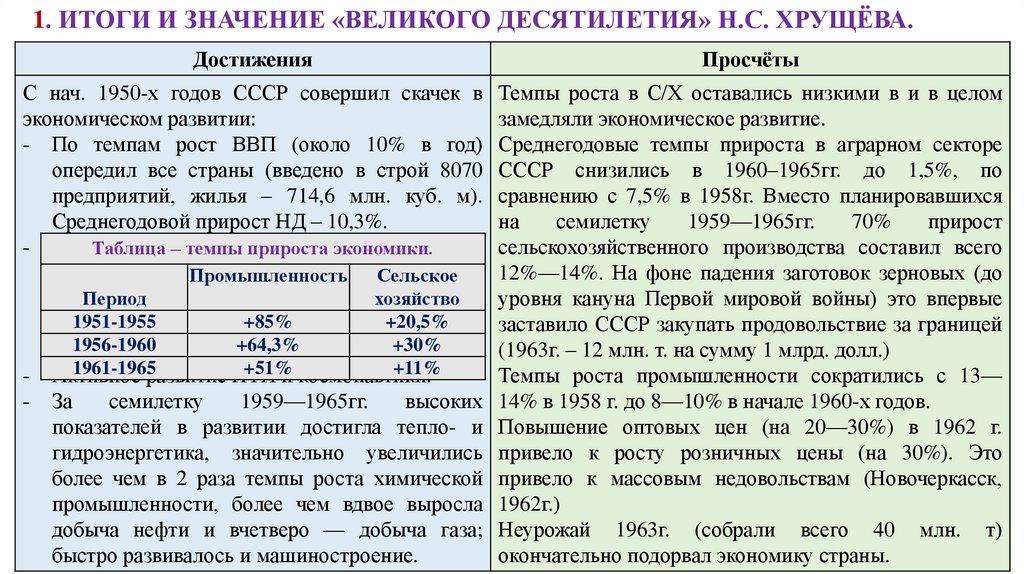 1. ИТОГИ И ЗНАЧЕНИЕ «ВЕЛИКОГО ДЕСЯТИЛЕТИЯ» Н.С. ХРУЩЁВА.Достижения