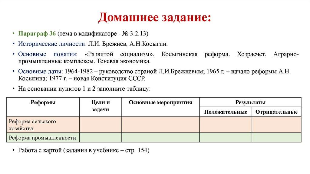 • Основные даты: 1964-1982 – руководство страной Л.И.Брежневым; 1965 г. – начало реформы А.Н.