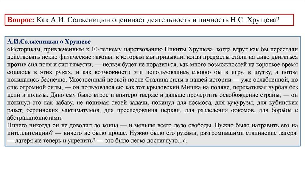 Вопрос: Как А.И. Солженицын оценивает деятельность и личность Н.С. Хрущева?А.И.Солженицын о Хрущеве