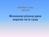 Множення різниці двох виразів на їх суму. Урок 29. Алгебра. 7 клас